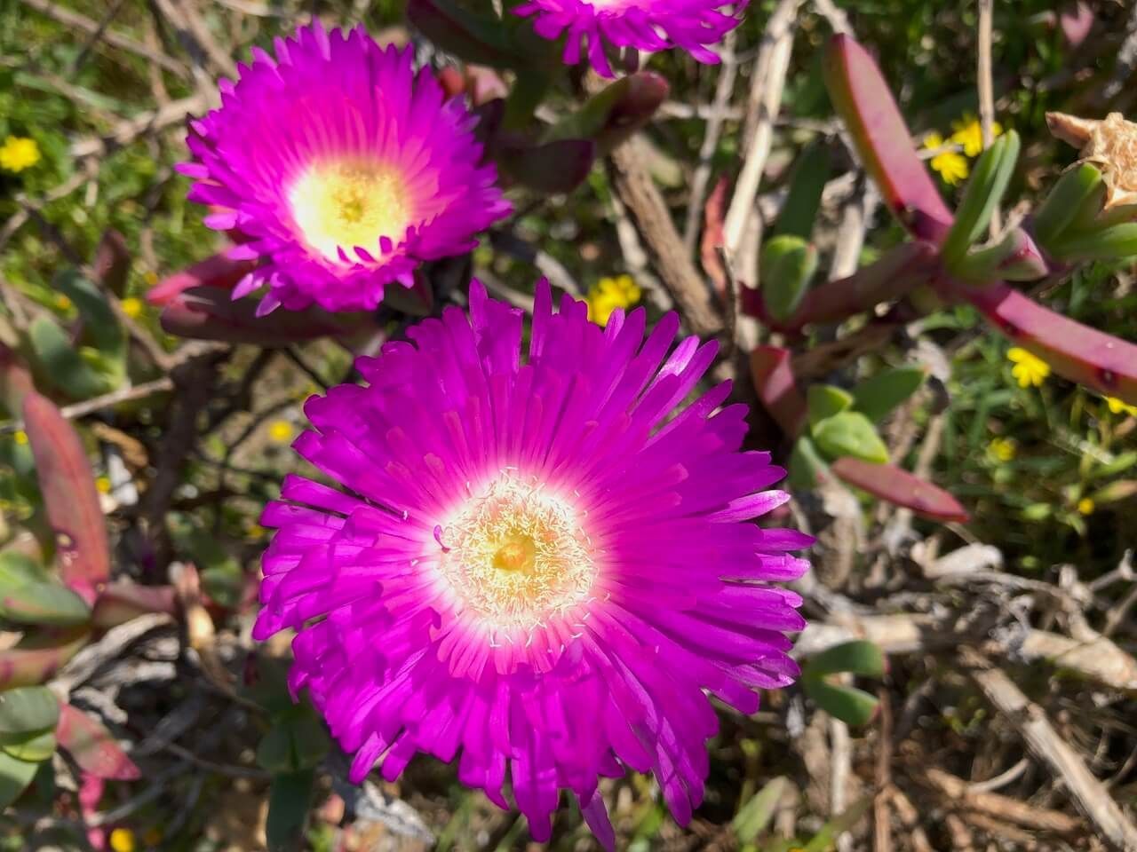 2. Local botanist Greg Keighery points out that native Carpobrotus are generally dioecious (that is, separate male and female plants): the native female plants have small pale pink flowers, smaller petals than the male and ‘a white centre with a prominent stigma in the centre.’ The native male plants ‘have larger flowers that are bright pink,’ have longer petals and are ‘yellow in centre (because of pollen filled anthers). By contrast the introduced C. edulis is a hermaphrodite. Keighery further points out that hybrids between C. edulis and C. virescens ‘have hermaphrodite flowers that are pale pink, larger than C. virescens.‘ For further insights see Keighery’s paper at http://cambridgecoastcare.com.au/wp-content/uploads/2015/05/P140A-2014-x-Greg-Keighery-Carpobrotus-SNEC-REPORT2.pdf