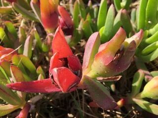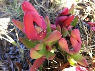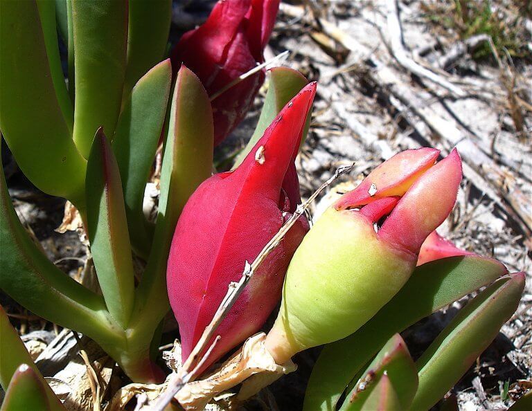 The colour of the fruit of C. edulis according to Marchant et.al. (1987: 77) is ‘dull yellowish’ whereas the fruit of our native species, both coastal and inland, is red or purplish-red when ripe. The fruit of the native species is smaller than introduced species. All Carpobrotus bear esculent fruit as the genus name implies (Greek carpos, fruit + brotos, edible). The Latin name edulis also means ‘edible.’