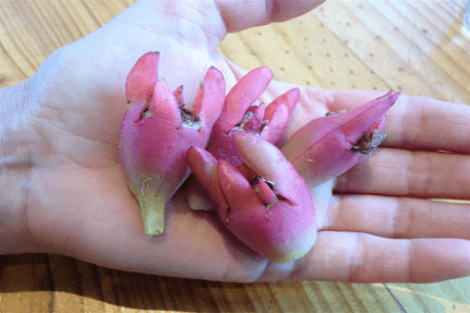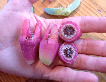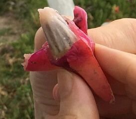 Carpobrotus is a summer fruit which in its ripened state contains numerous small dark brown seeds surrounded by a white pulpy mixture with a sticky consistency (see Plates 3 and 9-13). The fruit can be easily peeled or squeezed out from the base using one’s fingers. It is highly palatable and has a juicy and mucilaginous texture, tasting something between a strawberry and a fig with a slight salty aftertaste. In the traditional Noongar diet it provided a source of moisture, salt and plant sugars or carbohydrate and helped to stave off thirst and prevent dehydration. It acted similarly to modern day electrolytes – replenishing the body’s essential salts.