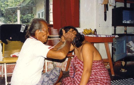 Towards the conclusion of the massage the belian firmly grasps a lock of hair from the crown of the client’s head (see Figure 7) in the region of the fontanelle between the frontal and parietal bones, twists the hair around his index finger, holds the tension for a few moments while subvocalising a jampi (spell) to invoke the unfriendly spirit to vacate the body. The belian then suddenly jerks the strands of hair upwards causing a popping sound (pertuk). For an instant the client looks stunned by the sudden upward jerking action. It is at this point that the belian is assured that the ketemuk has been expelled from the client’s body and informs his patient that his or her sickness has been removed.