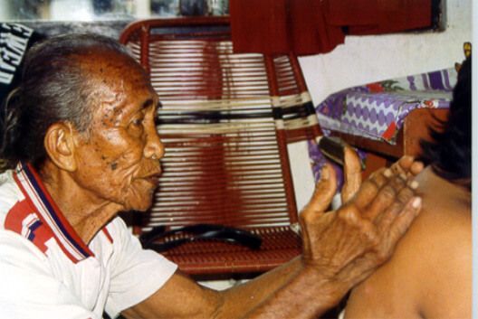 The patient receives an intensive head, neck and shoulder massage known as popot (see Figures 3-7). During this treatment the belian will spit (peru) and blow the pungent vapours of either turmeric or garlic onto the client’s neck, shoulder and thoracic region and this action is interspersed by a potent spell or jampi by the practitioner (see Figure 3 opposite). This ritual is believed to invoke the malign illness-causing agent to vacate the client’s body. According to Amaq Jamali the omnipresent jinn is the most common cause of ketemuk at the village level. It is repelled by acrid odours (garlic or turmeric) and salt. Saltwater baths were once a traditionally used method of treating ketemuk cases.4
