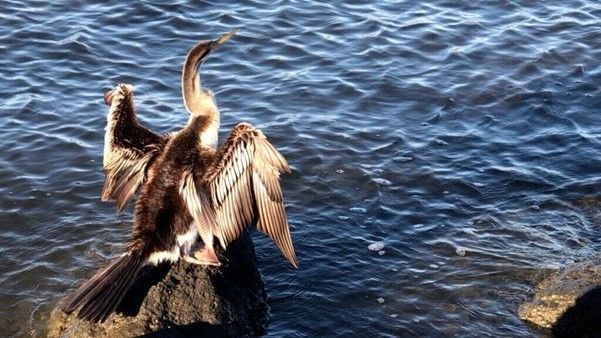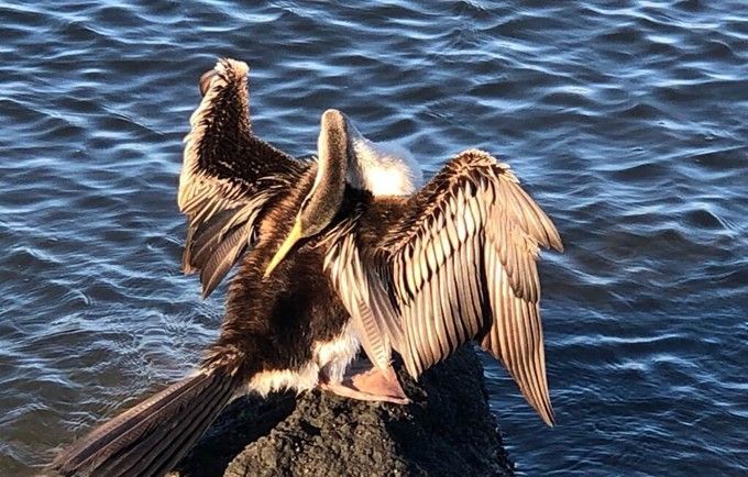 The darter with wings outstretched, preening itself while waiting for its water-soaked feathers to dry out before it can take flight. South Perth Foreshore. Photo by Barb Dobson, Dec 2021.
