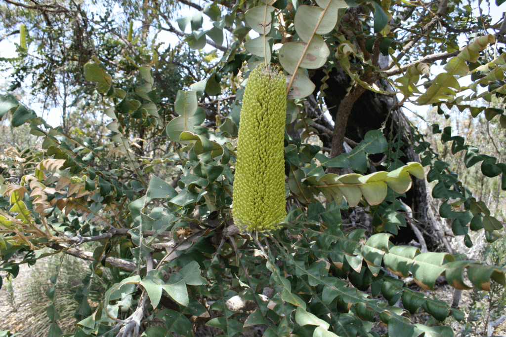 ‘On the barren, dry, stony hills and grounds rising from the beach Banksia grandis arrests the attention of the collector more particularly than any of its kindred indigenous around it. It forms a small tree of irregular growth, is very abundant, and at this season is in flower and young fruit.’ (21st January 1818 Cunningham’s diary entry, Oyster Harbour area, Albany)